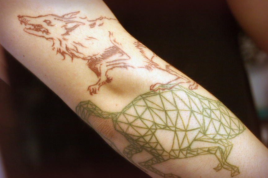 I always wanted tattoos and always felt I'd only be satisfied if I illustrated them myself. I illustrated these 2 wolves which represent my family crest. The Navarro crest has two identical golden wolves on a shield with seven x's surrounding them. My interpretation was to have one hairy red wolf, and a green digital wolf reminiscent of early 3D computer models. I figured the contrasting textures/colors would look interesting together.